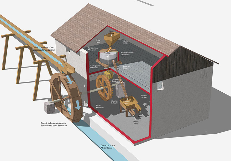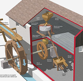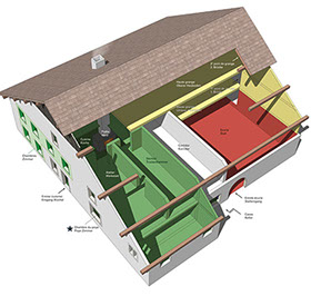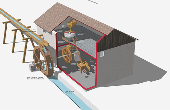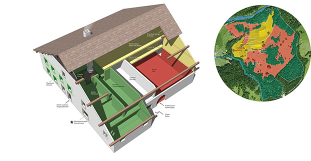 Schéma d'une ferme du 17e siècle (en couleur: les volumes de la ferme reflètent les surfaces du domaine)